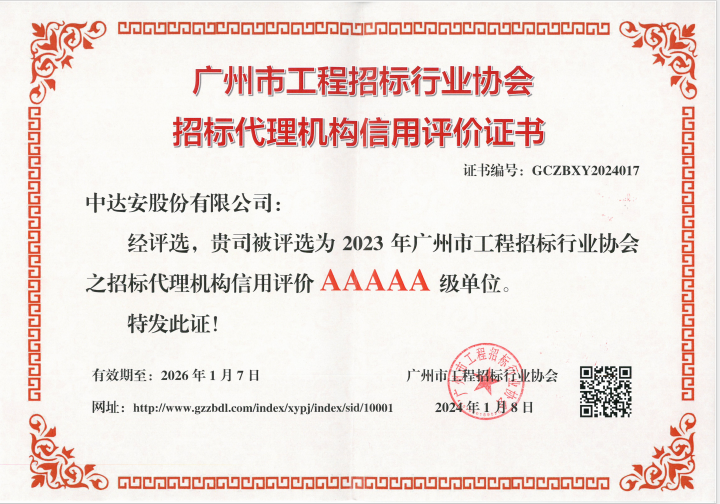 2023年廣州市工程招標(biāo)行業(yè)協(xié)會之招標(biāo)代理機(jī)構(gòu)信用評價AAAAA級證書