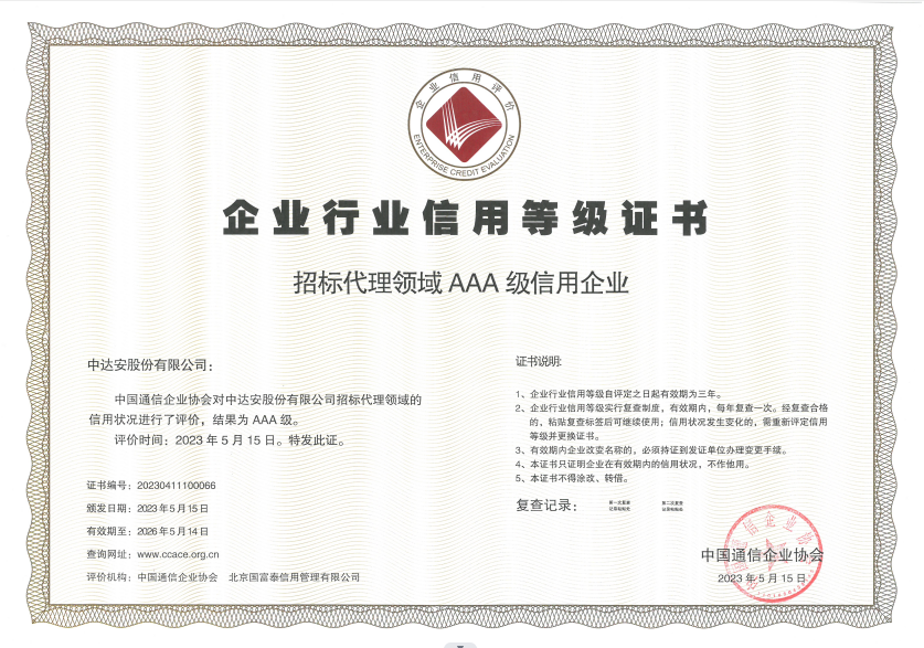 中國通信企業(yè)協(xié)會招標(biāo)代理領(lǐng)域AAA級信用企業(yè)
