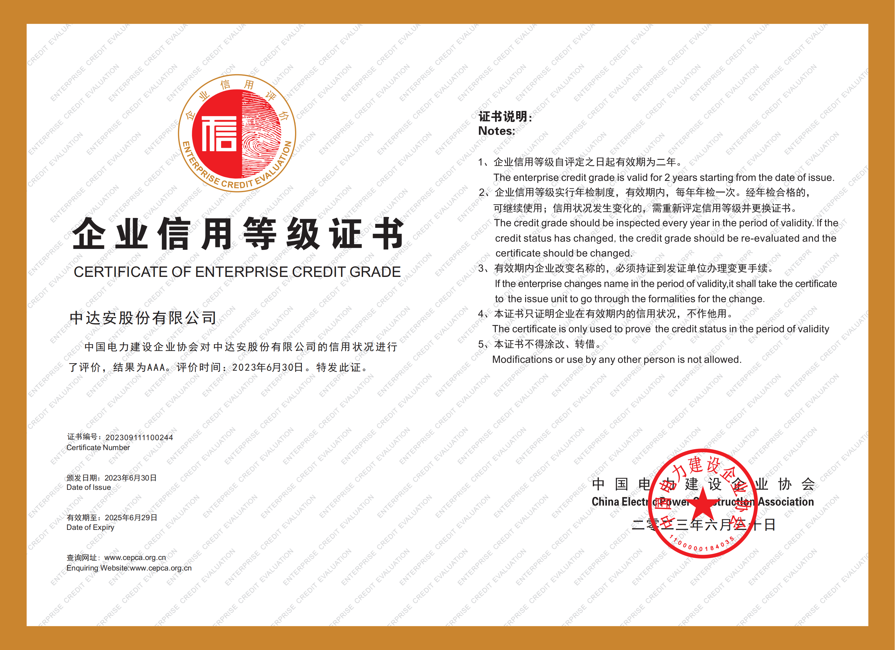中國電力建設(shè)企業(yè)協(xié)會企業(yè)信用等級證書AAA級